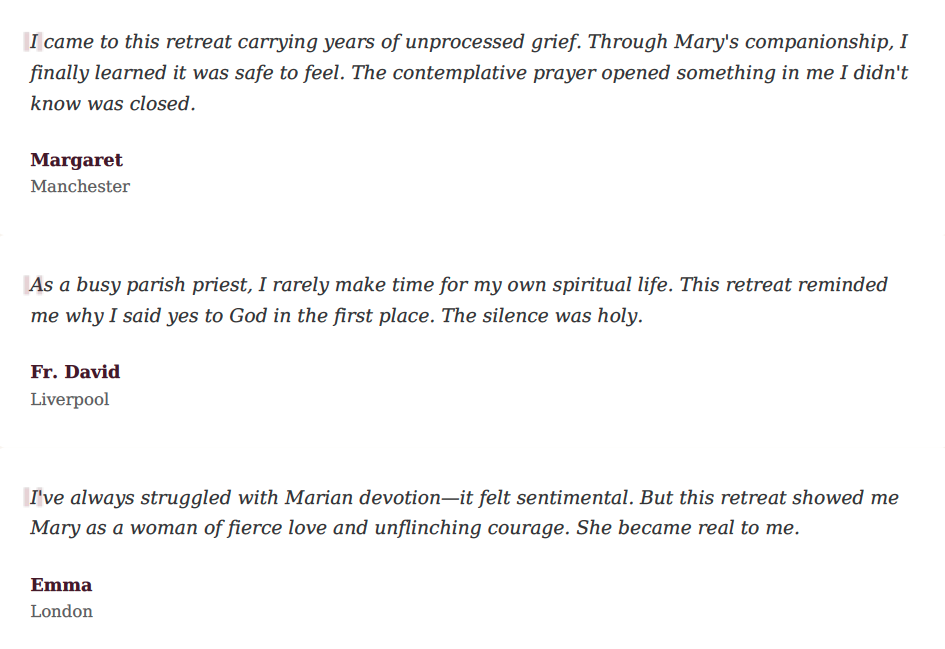 This is a deeply contemplative retreat, not a discussion group. We emphasize extended silence, guided prayer, and interior transformation. Drawing from Carmelite spirituality, we focus on encounter with Christ through Mary rather than intellectual study about Mary.