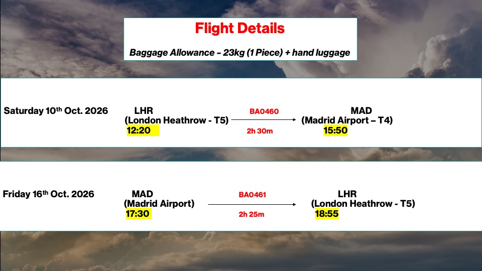 This option allows you to travel with the group on the scheduled flight from London Heathrow to Madrid. Please ensure you arrive at the airport at least three hours before departure. As noted above, the baggage allowance for each passenger is 23kg.
