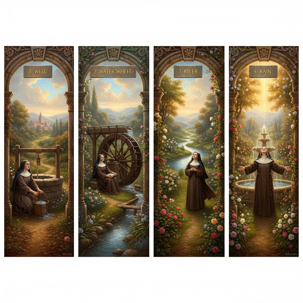 - After honestly examining my prayer life through Teresa’s framework of the Four Waters, what is the one concrete step God seems to be inviting me to take? Greater faithfulness, deeper surrender, more patient acceptance or simply continuing to water the garden day by day?